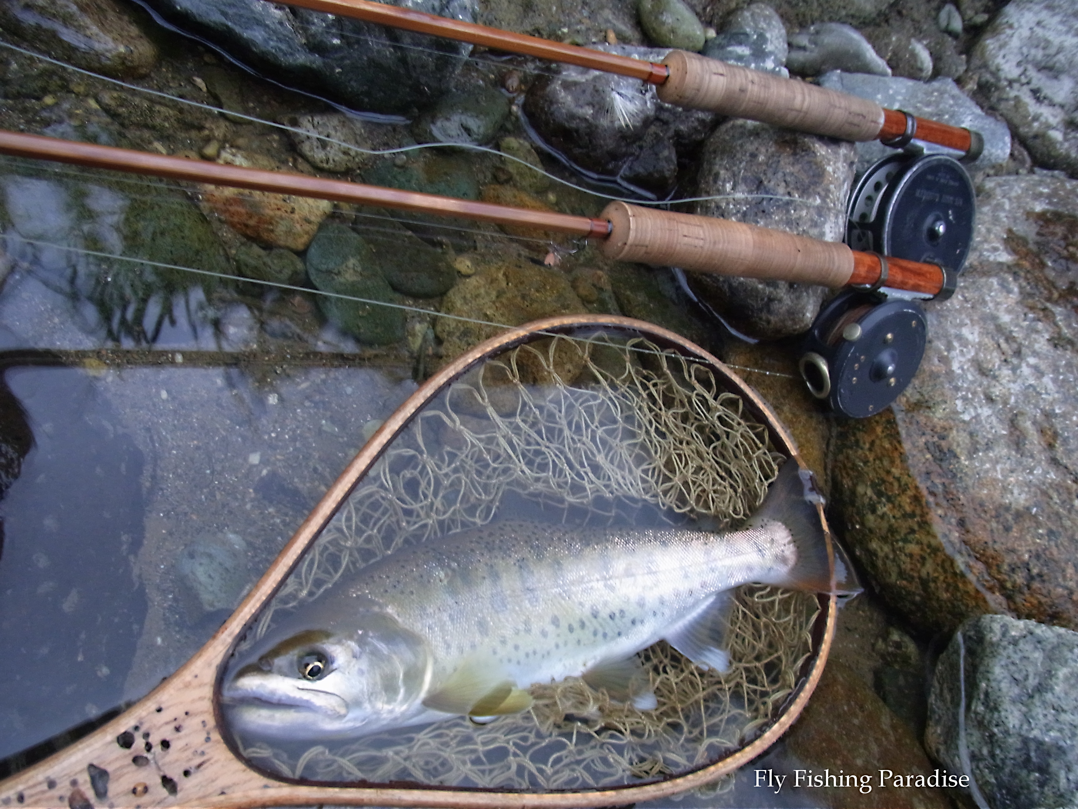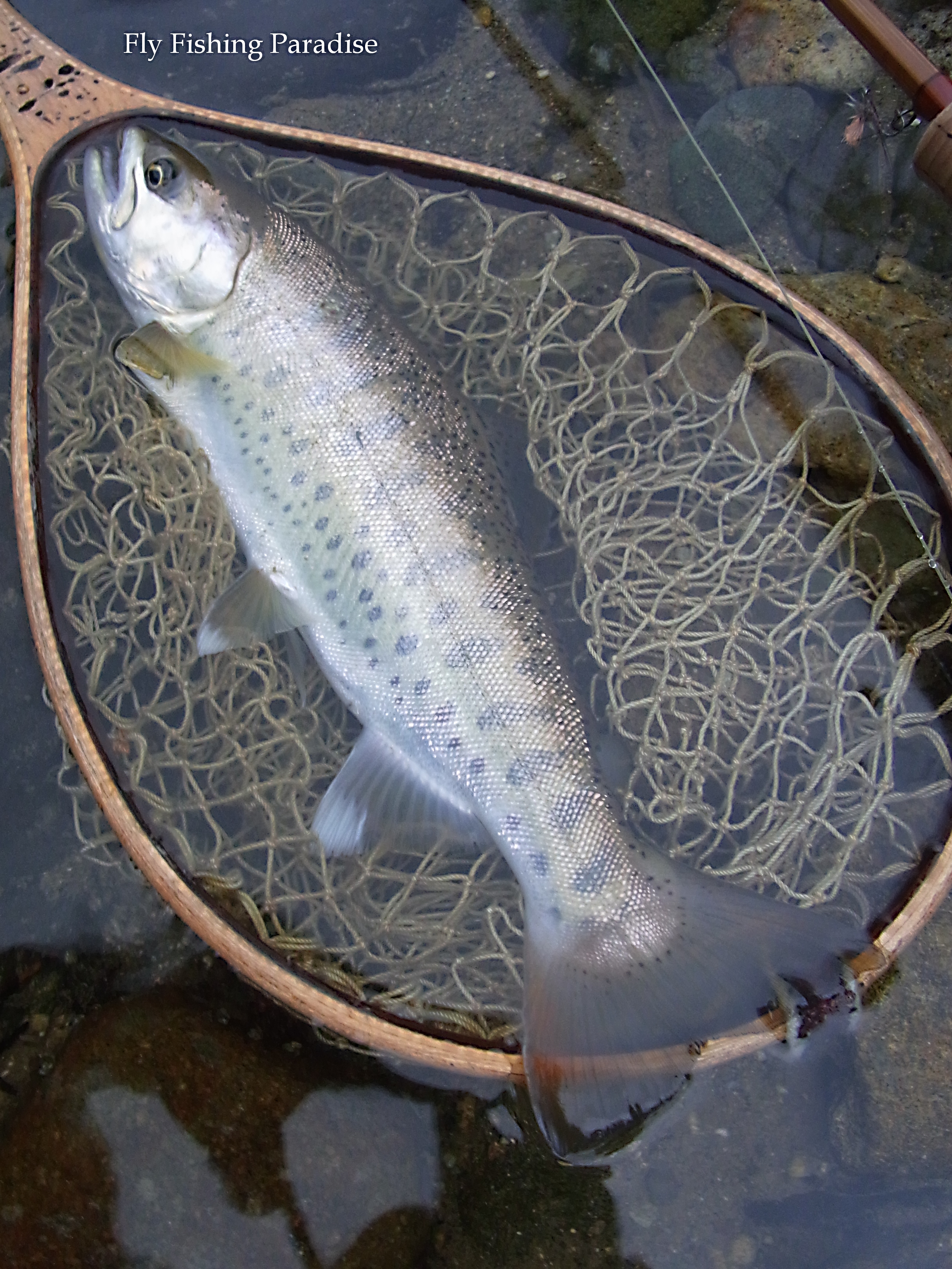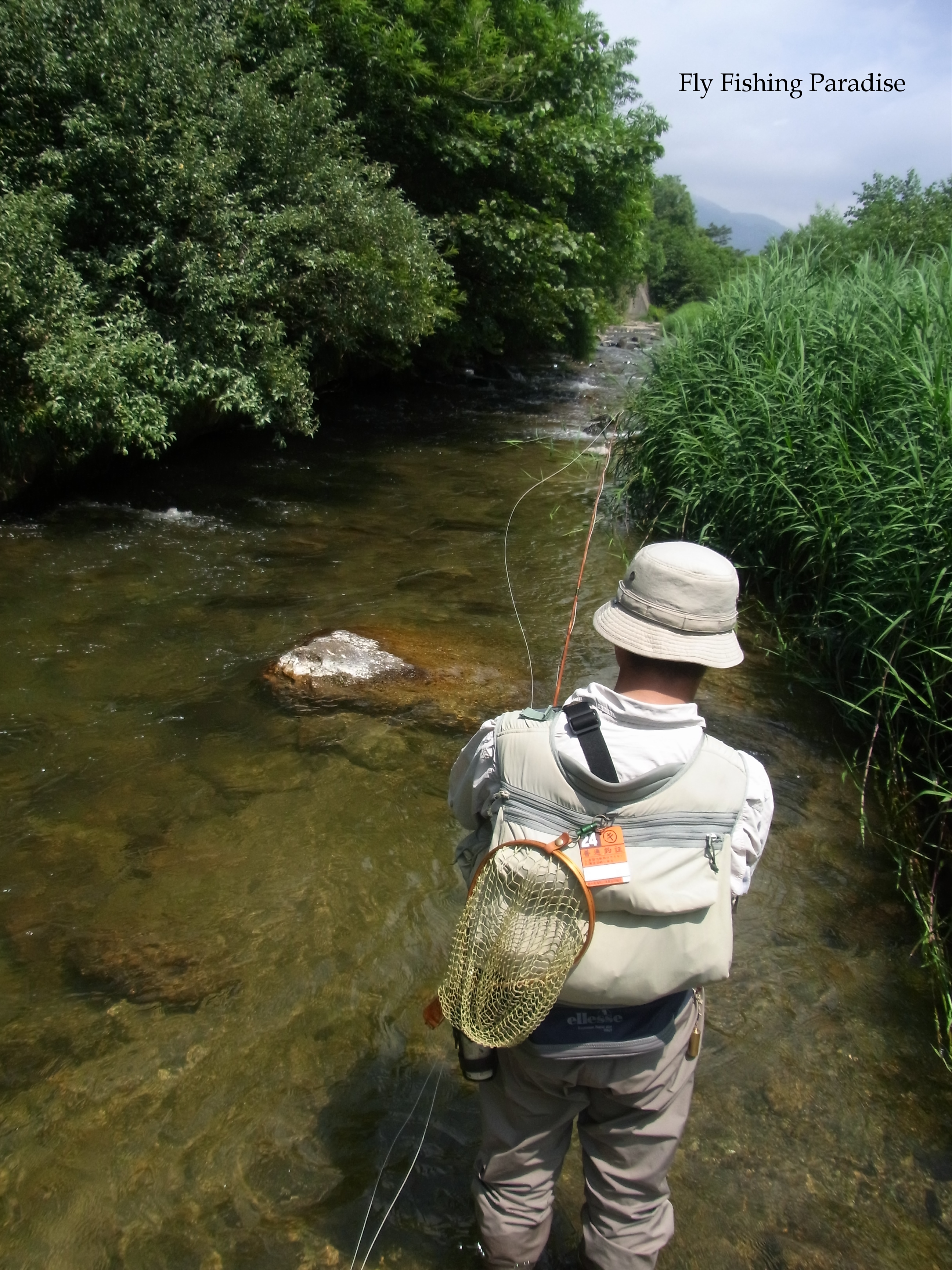 お昼過ぎに、沢で岩魚を狙おうとして持ち替えた宇田ロッド6’6″#3が根元からしなり、私をハラハラさせしたが何とかネットイン。